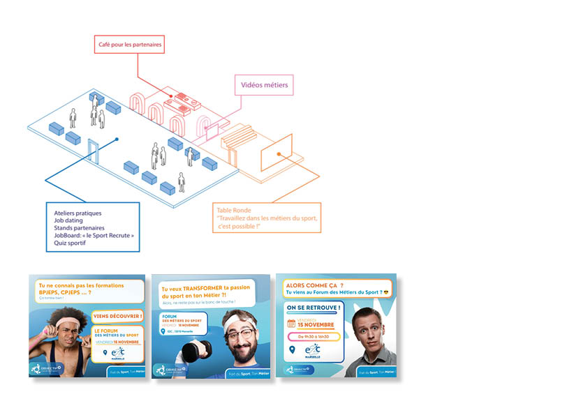 Objectif : Stratégie de promotion pour les événements métiers du sport, incluant scénographie, planification, communication sur les réseaux sociaux.